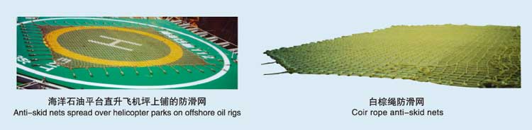 采用白棕繩、尼龍繩、防靜電尼龍繩為原料,編織采用交差穿插的方法,用于海洋石油平臺直升飛機坪、船甲板。